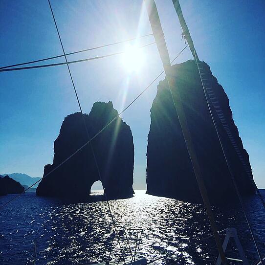 Ende Mai steht eine weitere Überfahrt auf dem Programm. Wir müssen vom Festland rüber nach Sardinien. Vorher genießen Karin und Detlef mit Peggy Sachs (Künstlername) das faszinierende Capri. Abends wird im Anblick der Faraglioni auf dem Saxophon musiziert, der Captain darf ein wenig auf dem Keyboard begleiten. Nach einer kurzen Visite in Ventotene verweilen wir zwei Tage auf einer der schönsten Inseln des Mittelmeeres, Ponza ist immer noch ein echter Geheimtip und natürlich in der Vorsaison besonders stimmungsvoll.