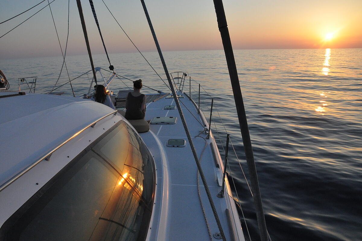 Mangels Wind werden aus den ca. 150 nautischen Meilen (ca. 290 km) bis Olbia eine fast 30-stündige Überfahrt. Dafür gibt's - angelockt von den Saxophon-Lauten Delfine ohne Ende.