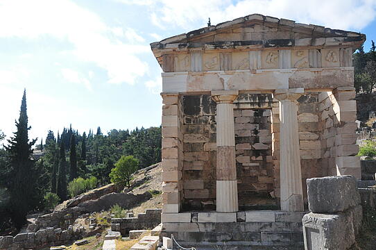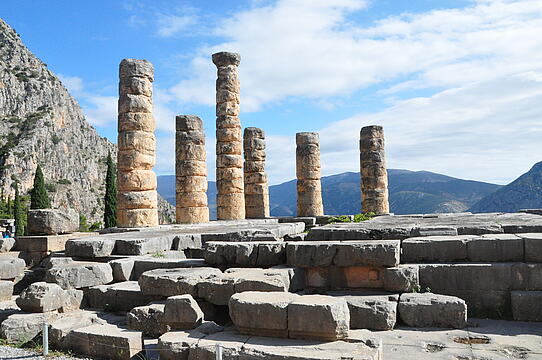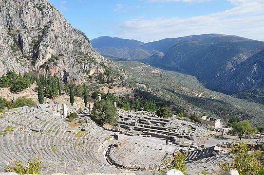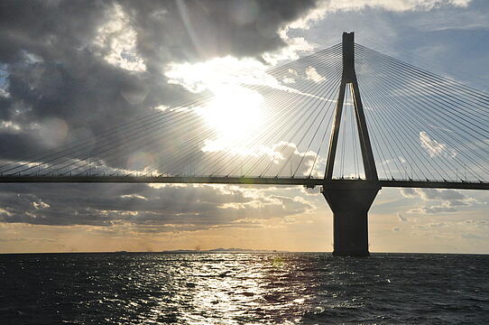 Jeden Morgen gibt es Frühsport auf Joya: ein Sprung in das inzwischen abgekühlte Wasser und Joya mehrmals umrunden, danach Gymnastik an Bord - das hält fit! 30 sm weiter östlich bei Patras taucht Joya unter der eindrucksvollen Brücke, die den Peleponnes mit dem Festland verbindet, hindurch. Wir haben uns vorgenommen, einen ressourcenschonenden ökologische Fußabdruck mit Joya zu hinterlassen, deshalb bleibt der Motor aus und wir kreuzen Stunde um Stunde den Golf von Korinth ostwärts bis nach Galaxidi. Von hier aus geht es an Land weiter mit dem Leihwagen in das sagenumwobene Delphi. Dort hoffen wir auf Weisheit und Inspiration durch das Lorbeerkauende Orakel.